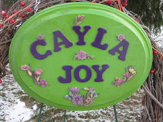 Yesterday, we all (Lowell, his mom, Samuel, and I) went to Cayla's grave. We haven't had the money to put a headstone at her grave yet. This summer we are planning on doing that. Meanwhile, it's been bothering Lowell that there's nothing there saying who she was or even what her little precious name was. So, Lowell went to Hobby Lobby, and he and Samuel bought a plain wood plaque, some plain wooden letters, stickers, spray paint and shellac. He painted the letters and the background and asked me to put them on the plaque somehow and then he shellacked the whole thing.